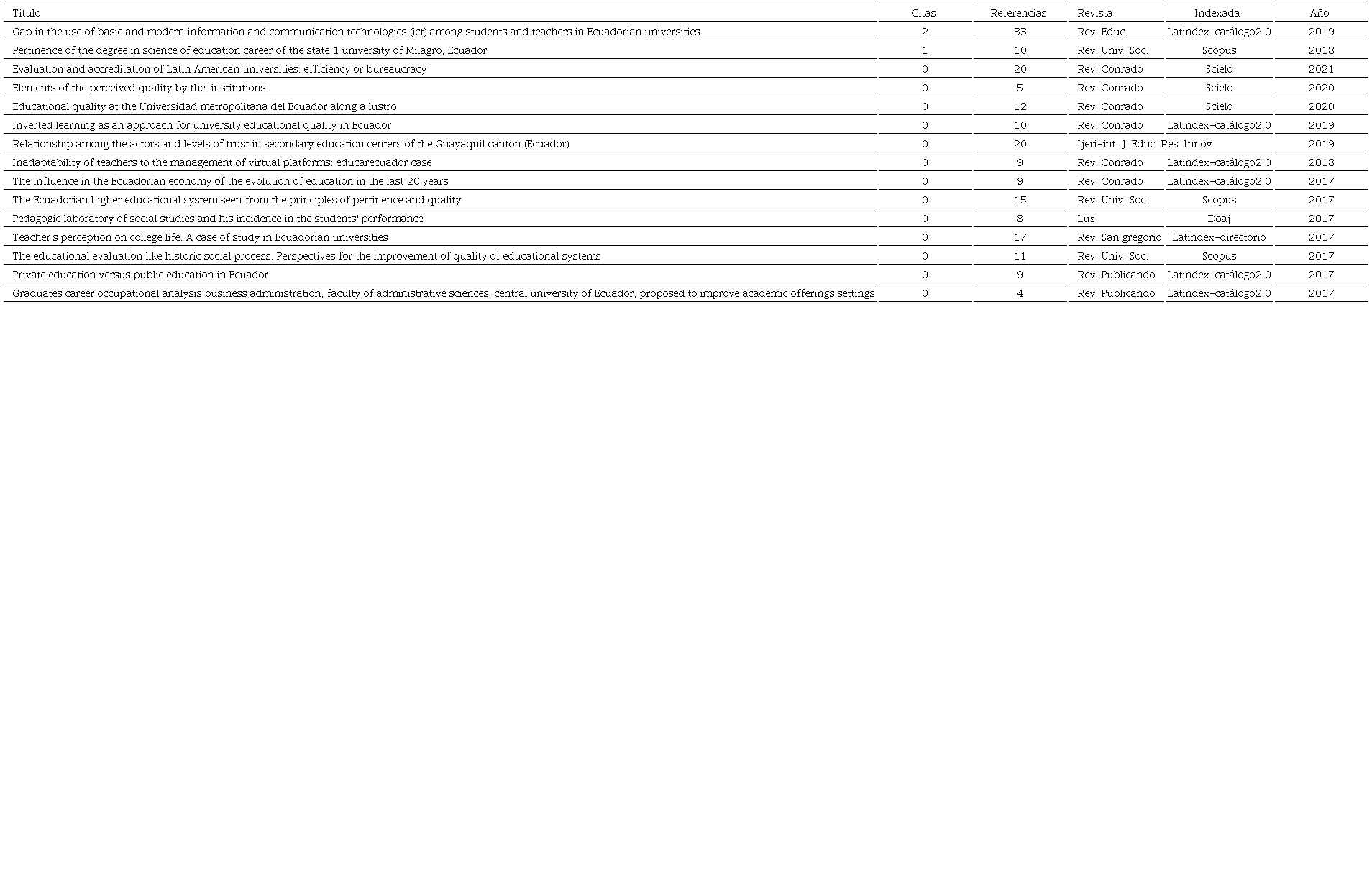 Respecto a los artículos mayormente citados, se evidencia una mínima cantidad de citas, donde, los manuscritos intitulados “Gap in the use of basic and modern information and communication technologies (ict) among students and teachers in Ecuadorian universities” y “Pertinence of the degree in science ofneducation career of the state university of Milagro, Ecuador” mantienen 2 y 1 cita respectivamente. Dichos documentos precisan un referente teórico y práctico sobre la evaluación educativa como un medio para garantizar la calidad en la educación (Tabla 4).