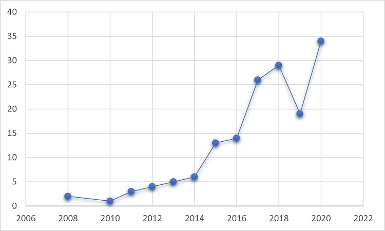 The first finding that could be found was the way in which the subject has grown year after year since its first appearance in what was in the registry of the data analyzed since 2008, with the only exception in 2019, where the documents published regarding it decreased. the previous year, but by 2020 he again propped up the issue. This statement can be better appreciated in graph 1.