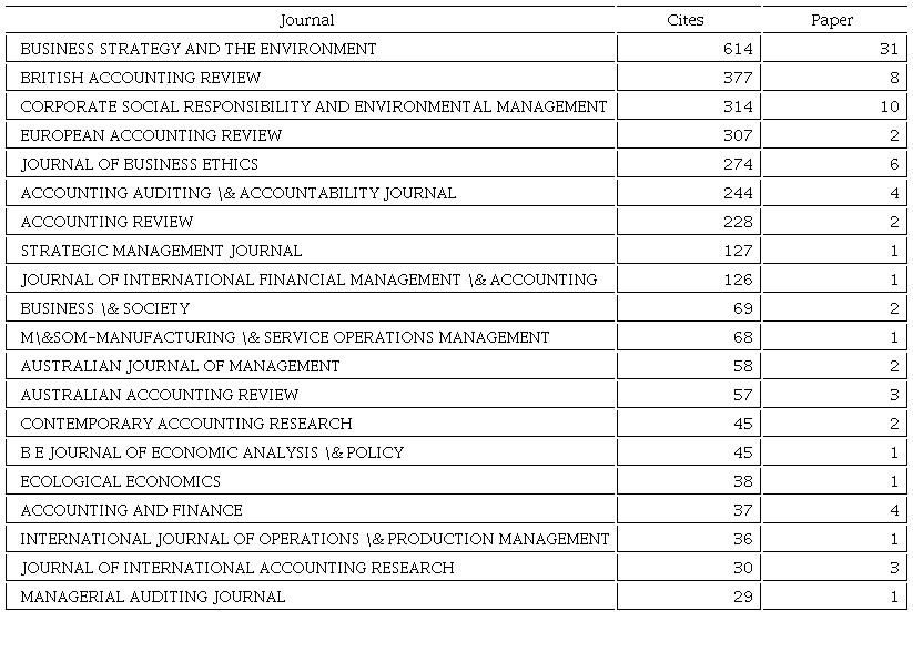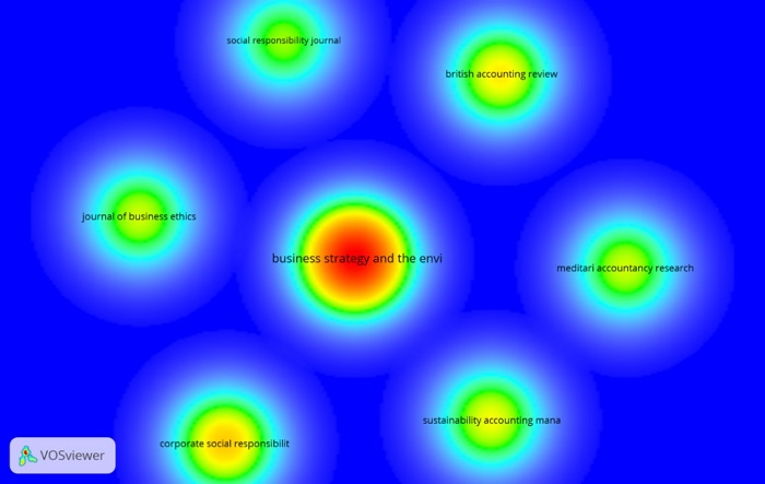 The most cited journal in the analysis was Business Strategy and The Environment (614), followed by British Accounting Review (377), Corporate Social Responsibility and Environmental Management (314) and European Accounting Review (307) (Table 1) which represent 51.6% of the total citations, which were 3,123, a fact that allows us to see that much of the discussion on carbon disclosure focuses on them. The density analysis of the journals is represented in Figure 1.