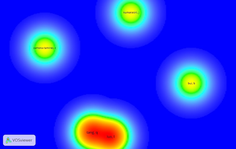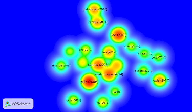 Figure 2 shows the density spheres of the most cited authors. This figure shows the creation of a cluster between the two authors most cited in table 2.