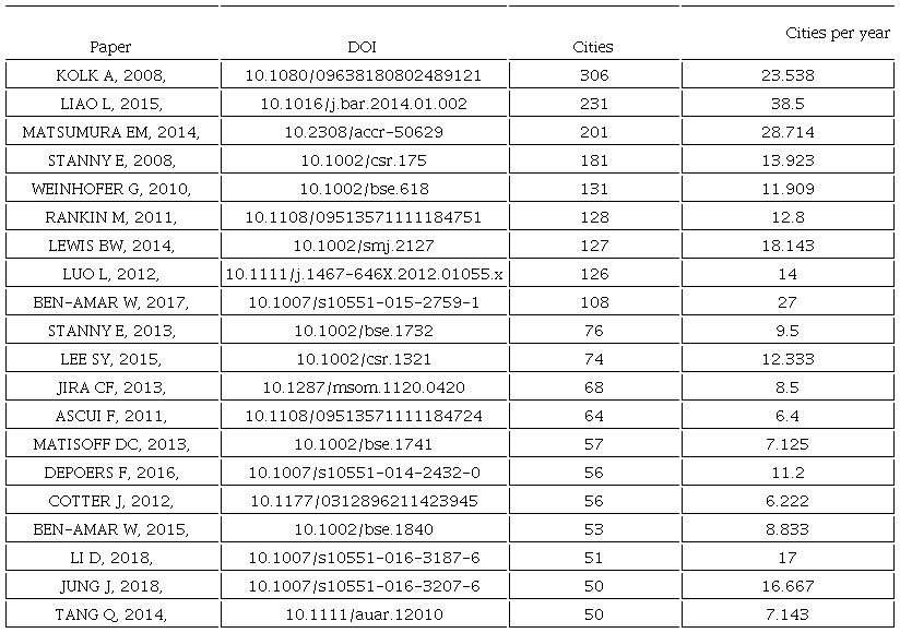Focus on carbon disclosure for business scholars has been increasing in the last twelve years starting in 2008 when the first publication about carbon disclosure was registered in social science, especially for business, economics, administration, and ethics. Till 2020, they were 178 articles published in different WOS journals, with an average of almost 15 papers per year, accompanied by a citation average per article of 19.91. This shows the gradual growth of the term in the social sciences. The leading journals for this topic were Business Strategy and The Environment, British Accounting Review and Corporate Social Responsibility and Environmental, covering 19.6%, 12.07% and 10.05% of the total cites. This shows about where the main knowledge about carbon disclosure is supported.
