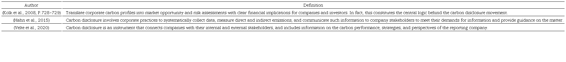 Carbon disclosure has been defined in several ways in the literature, however, there is a consensus in each of the definitions that have been formed on considering the risks, opportunities, benefits, and strategies by companies towards their carbon related information. Table 4 shows three of the most used definitions for the concept of carbon disclosure.
