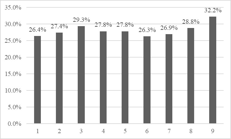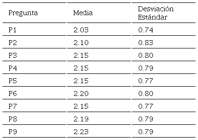 Como primer análisis estadístico descriptivo, para ubicar los valores obtenidos, la tabla 1, muestra los resultados de la media y la desviación estándar de cada una de las nueve preguntas resultantes de la muestra como referencia. Se observa que todas las respuestas están ubicadas, en base a su media, entre las respuestas tipo Likert 2 y 3, cargado más a la 2 (No, pero será considerado en el futuro).