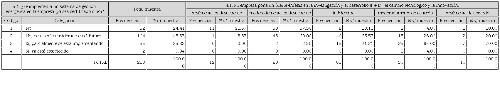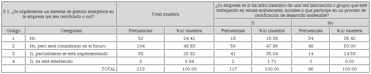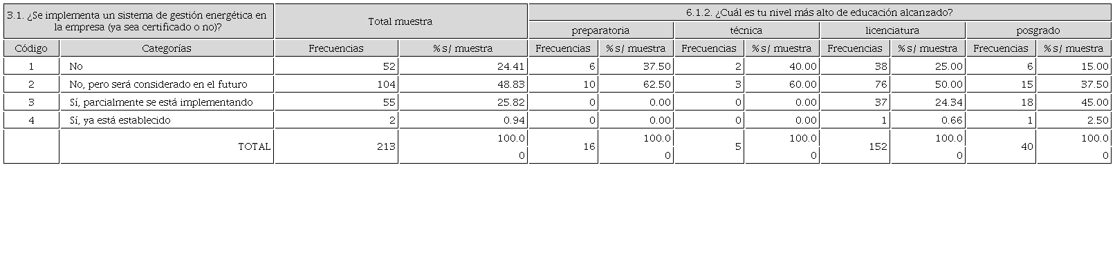Para conocer las respuestas de la escala de Likert 3 y 4, que se interpretan como intención de implementar la gestión energética sustentable en su empresa, los resultados de sus frecuencias nos muestran que en cuanto a la primera pregunta sobre si se implementa un sistema de gestión energética en la empresa. Se encontró que el 26.4% lo ha implementado. La segunda pregunta acerca de si el uso de energía es un factor considerado en la planificación a largo plazo. El 27.4% lo consideró dentro de su planeación. La tercera pregunta gira sobre si los usos significativos de energía son identificados y monitoreados. El 29.3% hace esta tarea en forma sistemática. La siguiente pregunta es acerca de si la empresa realiza la evaluación del rendimiento energético actual. El 27.8% lo lleva a cabo.
