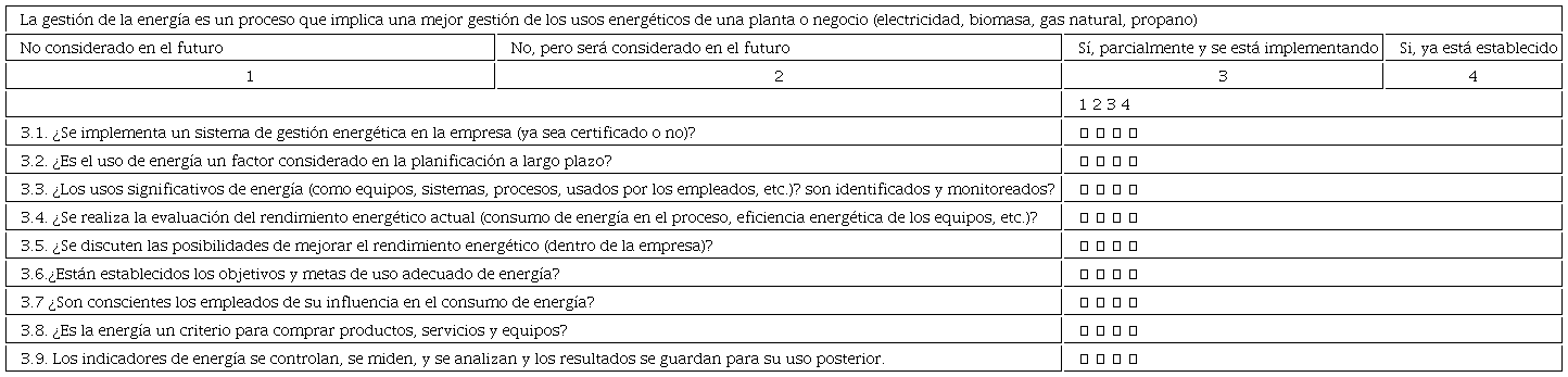 Esta investigación es de corte transversal y cuantitativa. Para conocer las prácticas de gestión energética empresarial, se aplicó un cuestionario a los dueños o encargados de la PYME, denominado “Encuesta sobre la integración del desarrollo sostenible en el contexto de las PYME”, desarrollado y validado por la École de Gestion de la UQTR (2019), basados en la determinación de la madurez energética empresarial (Labelle, et al., 2022). Para este estudio en particular se tomó la sección 3-A denominada Gestión Energética, que consta de nueve preguntas tipo Likert al respecto. Las respuestas guiadas fueron: (1) no considerado en el futuro, (2) No, pero será considerado en el futuro, (3) Sí, parcialmente y se está implementando, y (4) Si, ya está establecido. Se ha ajustado las respuestas tipo Likert a cuatro posibles respuestas, basado en el criterio que utiliza Jovanovic, et al., (2017, p. 1146 ), que se fundamenta principalmente en saber si se tienen intenciones de implementar esta gestión energética sustentable (sí o no). En caso negativo, se divide a su vez, para saber si no está considerado, o en la medida que se tomará llevar a cabo esta acción y en cuánto tiempo. En caso afirmativo, saber si está en proceso, o bien si ya está implementado. Para considerar una gestión energética establecida en la PYME se han considerado las respuestas 3 y 4 (ver cuestionario aplicado en anexo A).