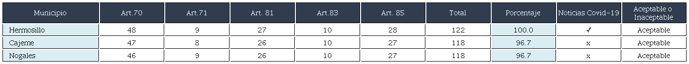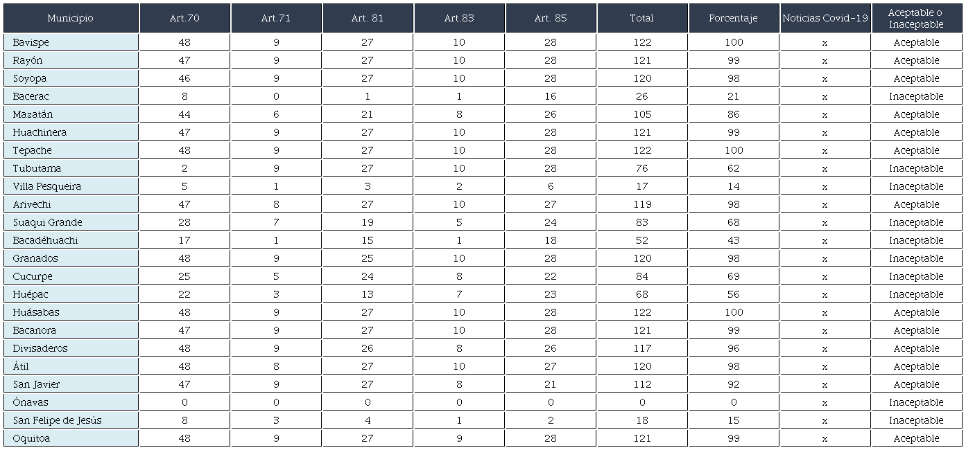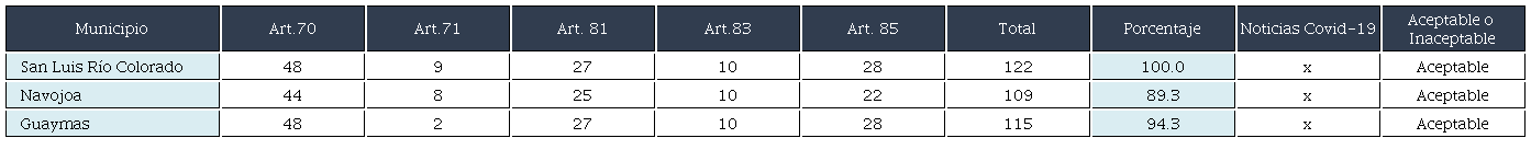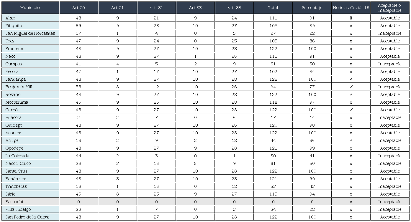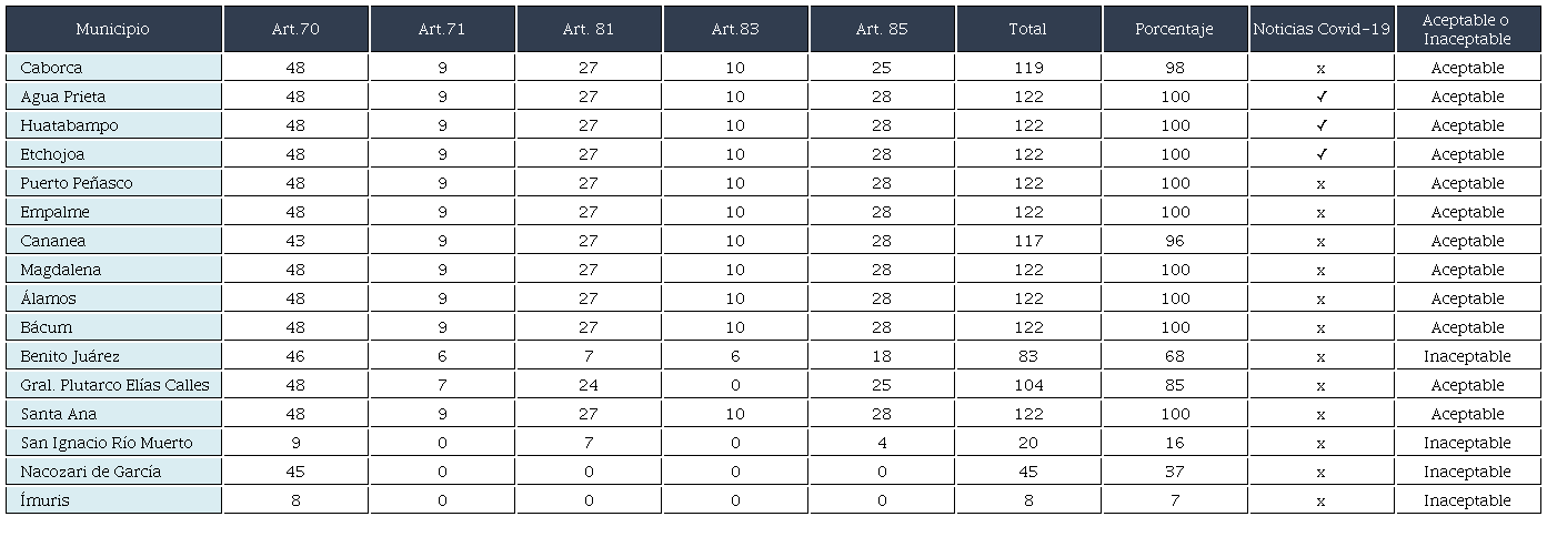 Con el objetivo de realizar la evaluación de los 72 ayuntamientos del estado de Sonora en materia de transparencia del periodo 2019-2021, correspondiente al tiempo de Covid-19, se realizó el análisis de los indicadores marcados por las actuales leyes de transparencia aplicables a dicho ámbito de gobierno.