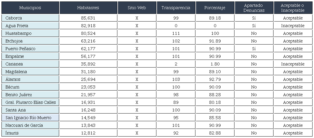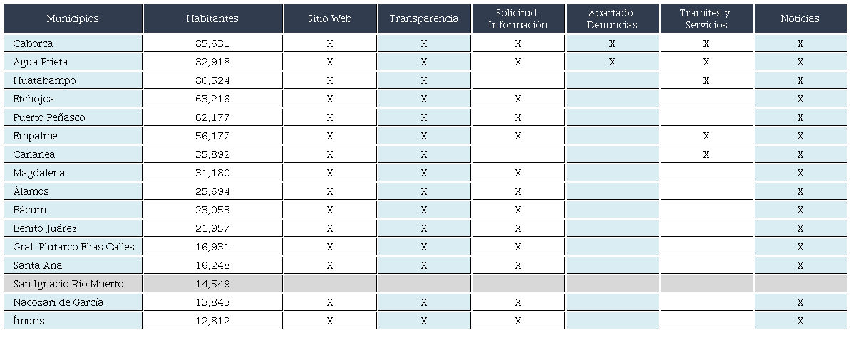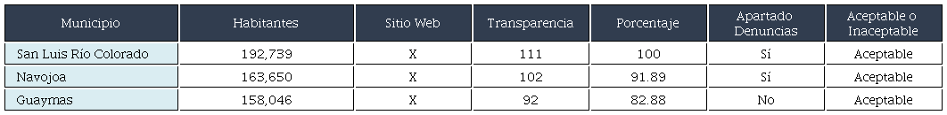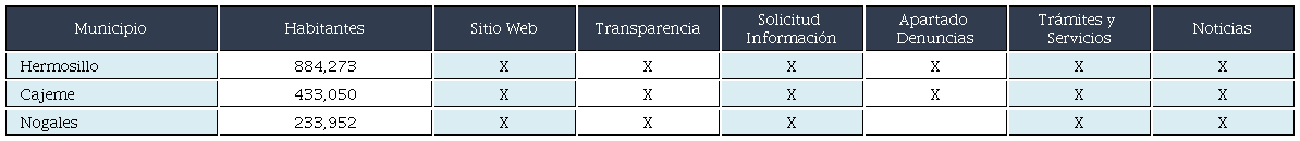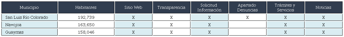 El estado de Sonora cuenta con 6 municipios cuya población es mayor a 100 mil habitantes registrados; son los que cuentan con mayor presupuesto para invertir en los diversos sectores productivos. Al ser los municipios con mayores recursos se puede esperar que cumplan con todo tipo de especificaciones en su portal de acceso web y con ello puedan ofrecer una mejor fuente de información a sus ciudadanos.