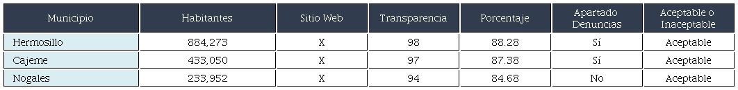 Los ayuntamientos de Nogales, Navojoa y Guaymas no cumplen en su totalidad con la funcionalidad de sus respectivos sitios web, al fallar en el concepto de reportes y denuncias, pero sí cumplen su cometido con respecto a la ley de acceso a la información pública del estado de Sonora.