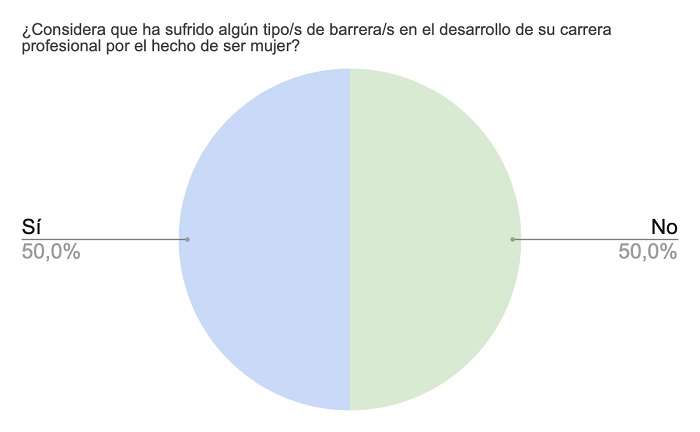 Por otro lado, el 50% de las encuestadas, consideran no haber sufrido ningún tipo de barrera en el desarrollo de su carrera profesional por el hecho de ser mujer, frente al 50% de ellas que sí aseguran haber sufrido algún tipo de barrera (gráfico 2).