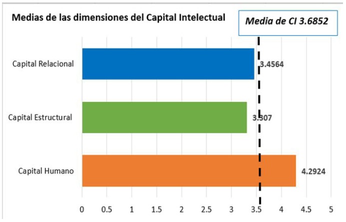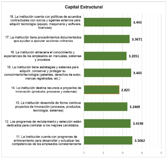 Finalmente se identifica el capital estructural, que muestra una media de 3.30 y refleja la importancia de los procesos dentro de la IES para los docentes, así como la infraestructura, metodologías, procedimientos, tecnologías de proceso y productos almacenados en la organización mediante bases de datos, entre otros aspectos.
