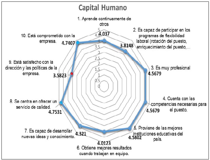 En relación con la dimensión del capital humano por ítem, se muestra en el gráfico 2 2 que todos los ítems están por arriba de 3.5 en la escala, ya que el capital humano fue la dimensión con la mejor evaluación en comparación al capital estructural y capital relacional, las medidas de los ítems se encuentran desde 3.58 que es el valor más bajo y que se refiere a la satisfacción con la dirección y políticas de la institución, mientras que el valor más alto es de 4.75, que representa a los docentes que ofrecen un servicio de calidad y el compromiso con la institución, que también se representa con un 4.74.