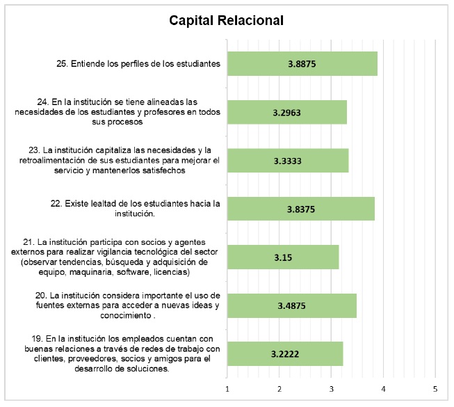 Posteriormente, se encuentra en segundo lugar el valor del capital relacional con un 3.45, que hace referencia a la percepción de los docentes respecto de la relación de la institución con los agentes del entorno, tales como: los clientes internos y externos, los competidores, proveedores, entre otros. Además, dentro de este grupo se incluyen elementos como; la lealtad, la satisfacción, reputación de la institución, así como las interrelaciones que persisten con otros agentes.