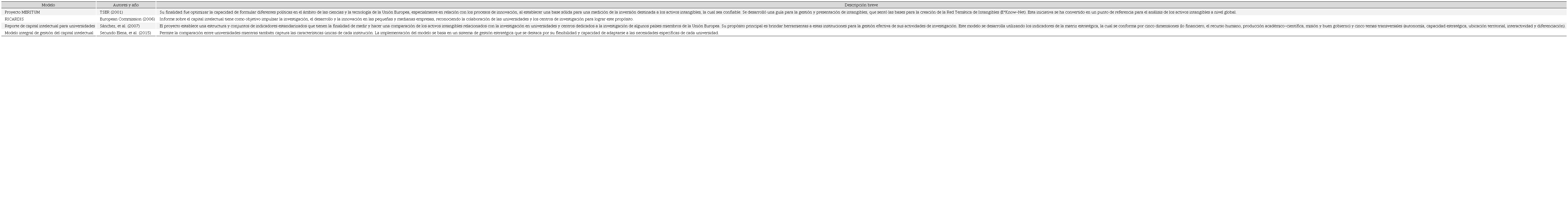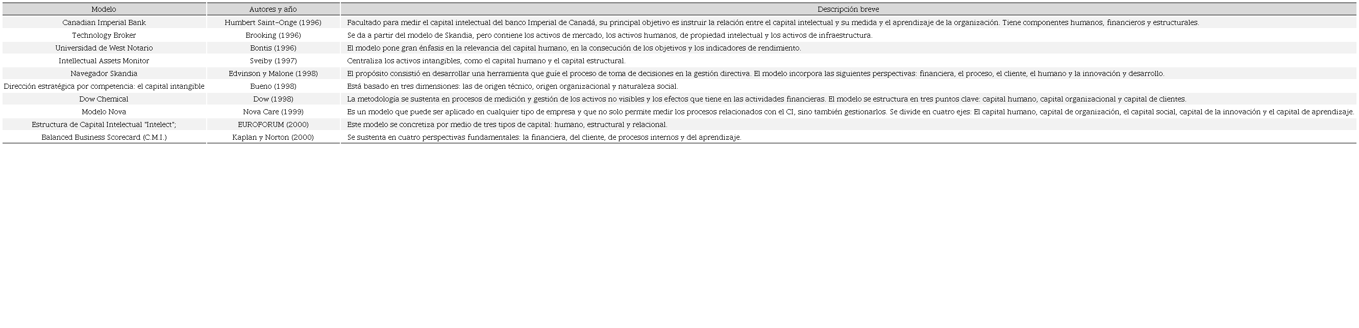 González y Rodríguez (2010), mediante un constructo teórico bibliográfico, recopilaron los modelos comúnmente utilizados para medir el capital intelectual, los cuales también son los más conocidos cuando se habla de gestión del conocimiento, los modelos consideran elementos generales, industriales y educativos; permitiendo identificar el modelo más adecuado para establecer ciertos indicadores que se pueden presentar en las universidades e instituciones de educación públicas. La Tabla 1 explica brevemente los alcances de solo algunos modelos, los cuales son vistos desde diferentes perspectivas, unos enfocados en lo financiero y organizacional, otros haciendo énfasis al individuo y la infraestructura.