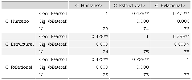 A continuación, para la hipótesis 1 se usó la correlación bivariada mediante el coeficiente r de Pearson, con la cual se miden las relaciones entre las dimensiones del capital intelectual, los resultados se muestran en la tabla 3, donde si existen diferencias estadísticamente significativas para decir que hay relación entre las dimensiones del capital intelectual (capital humano, capital estructural y capital relacional), es decir, el valor del Sig. (bilateral) es de 0.000 que indica que la correlación es positiva moderada y fuerte, ya que las variables se asocian en sentido directo.