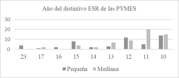 Con base en la información recabada identificamos que 59 empresas son de tamaño mediana y 51 son pequeñas representando el 54% y 46% respectivamente; como se aprecia en la figura 3 las empresas de tamaño pequeña resaltan la obtención del distintivo ESR por décima y duodécima vez y en el caso de las medianas por undécima y décima vez. También se puede identificar que la obtención del distintivo ESR por vigesimotercera y decimosexta vez únicamente fue para las pequeñas empresas. Y no se identificó el distintivo ESR por decimoctava, decimonovena, vigésima, vigesimoprimera y vigesimosegunda vez ni en las pequeñas ni en las medianas empresas.