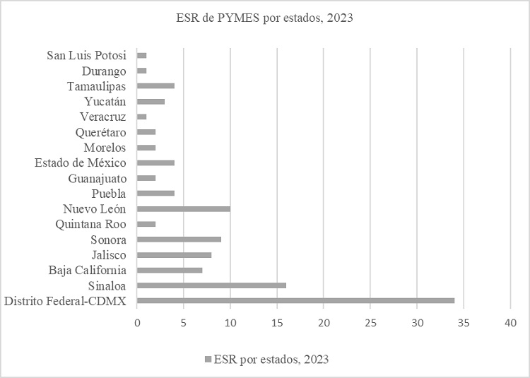 La figura 5 nos muestra un análisis detallado referente a las 110 PYMES analizadas, identificando en que estados de México hubo mayor obtención del distintivo ESR. Dando como resultado la participación de 17 estados de un total de 32. Resaltando el Distrito Federal y la Ciudad de México (CDMX) con 34 PYMES, seguida de Sinaloa con 16 PYMES, Nuevo León con 10 PYMES, Sonora 9 PYMES, Jalisco 8 PYMES y Baja California 7, por consiguiente, tuvieron mayor participación los estados del Norte de México. Veracruz, Durango, y San Luis Potosí únicamente contaron con una PYME con el distintivo ESR. Asimismo se puede identificar la falta de participación de diversos estados correspondientes al Sur de México, tales como Campeche, Tabasco, Oaxaca, Guerrero, entre otros.