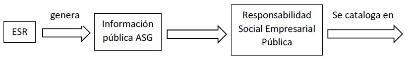 Con base en la información analizada respecto a la RSE, ASG y el distintivo ESR. Es importante mencionar que son conceptos que estan ligados, y es necesario ordenarlos. En primera instancia se identifican los ámbitos de la ASG ya que son la base para identificar si la empresa esta aplicando RSE, es decir, es como una consecuencia, y finalmente ya teniendo tanto la ASG como la RSE se obtiene el distintivo ESR. Si bien la teoria nos dice que primero surgio la RSE y posterior la ASG es importante tener en cuenta que si no hay aspectos relacionados con ASG no se podria tener un RSE; por eso siempre iria en ese orden. (Véase figura 1)