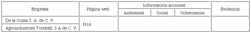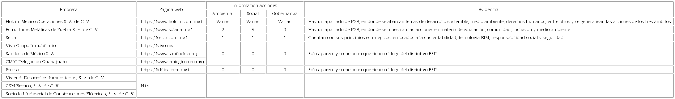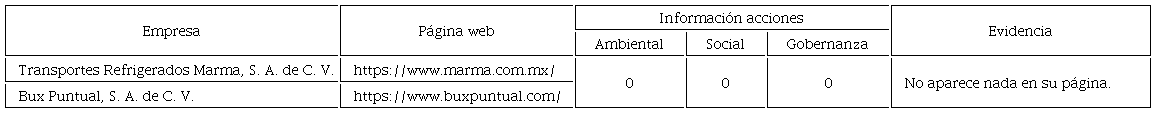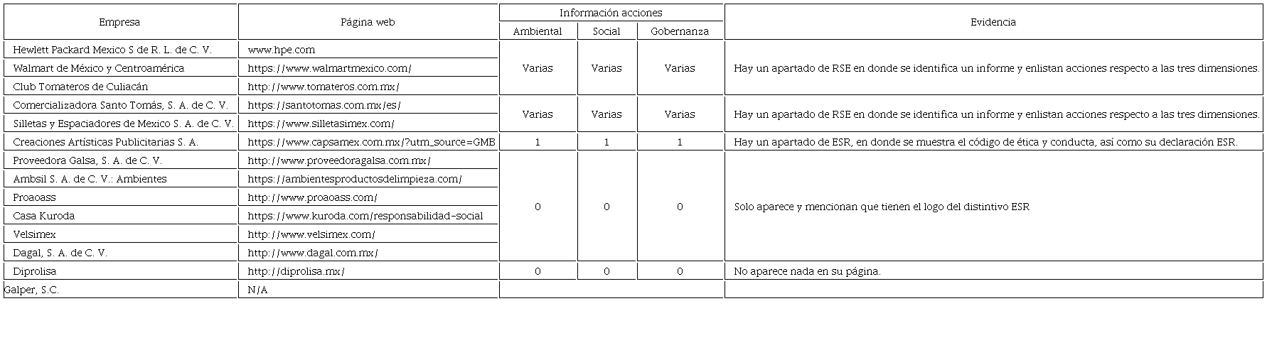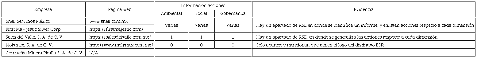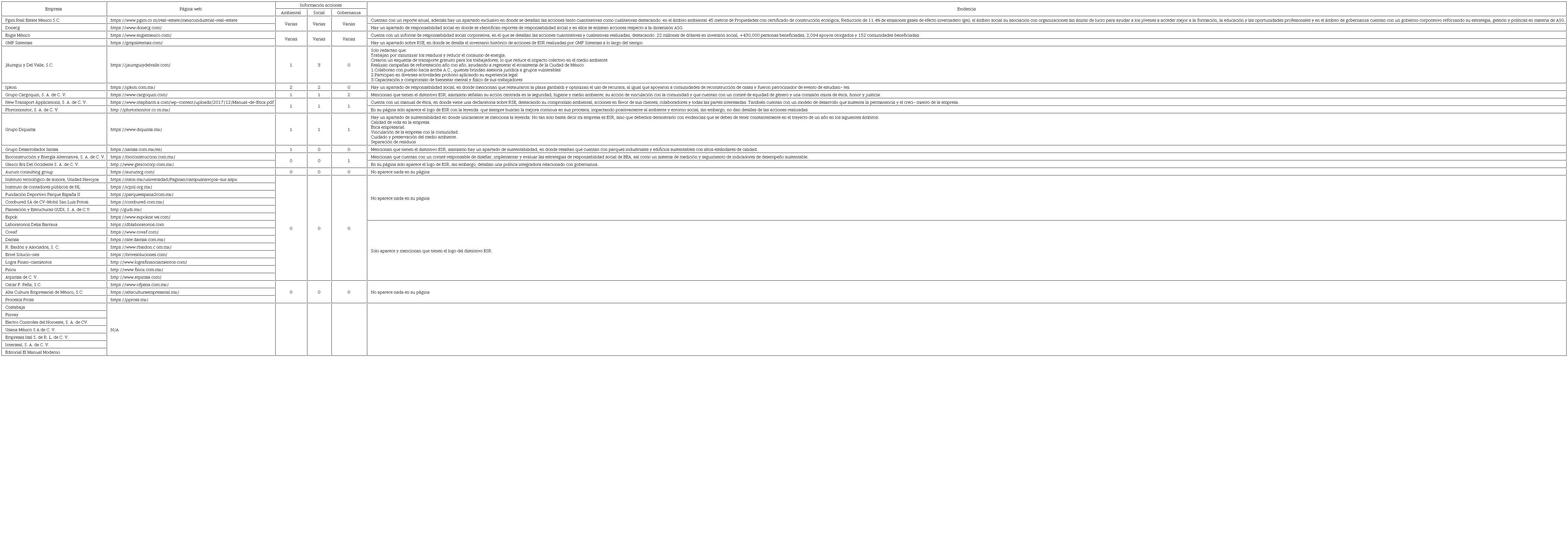 En primer lugar se identificaron los siguientes datos: el año como ESR, cantidad de pequeñas y medianas empresas, el sector al que pertenecen asi como su Estado de las PYMES determinadas en la muestra. Como segundo punto, apartir de las PYMES por sector identificadas nos centramos en analizar, sintetizar y registrar datos respecto a: nombre de la empresa, página web e información publica identificada de las acciones del ámbito ASG de las PYMES de los siete sectores, estableciendo las evidencias ccorrrespondientes. (Vease cuadro 6 al 12). Y finalmente, con base en el análisis y síntesis de la información documental obtenida de las páginas web respecto a las acciones del ámbito ASG de las PYMES determinadas en la muestra, se catalogaron a las diversas PYMES de los siete sectores en tres categorías: Responsabilidad Social Empresarial Pública Alta, Responsabilidad Social Empresarial Pública Media y Responsabilidad Social Empresarial Pública Nula. (Vease cuadro 5)