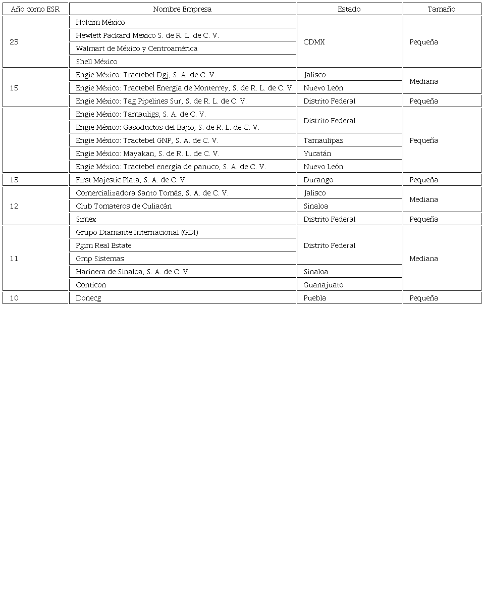 El CEMEFI cuenta con una base de datos; donde se publica año con año a las empresas mexicanas que cumplieron con los estándares para obtener el distintivo ESR, asi mismo, contiene información respecto a: año como ESR, Razón Social, Nombre de la empresa, Estado, Sector, Tamaño. Para el año 2023, el mencionado distintivo lo obtuvieron un total de 2,351 empresas, las cuales incluyen todos los sectores, tamaños y Estados. De las cuales 1,044 son grandes empresas, 494 son medianas, 650 pequeñas, 157 micro, 6 no disponible el tamaño.