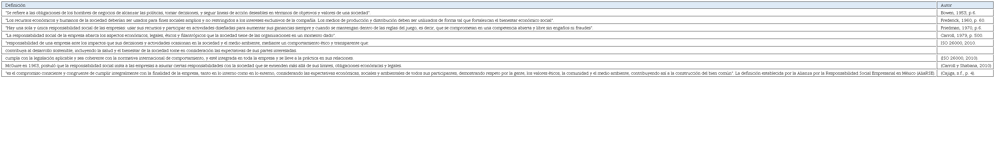 Actualmente hay varias definiciones sobre RSE, algunas de ellas se detallan en el cuadro 1; Carroll (1979) unificó la RSE, clasificándola en cuatro grupos: económico, legal, ético, y filantrópico. La cual ha sido ampliamente utilizada en el ámbito de la investigación. Por otro lado, la RSE ha ido adaptándose al contexto que se presenta: no sólo en el ámbito financiero, también últimamente se está centrando la atención en el desempeño no financiero. De acuerdo con Elembilassery (2023), desde el 2010 hasta el 2020, el hablar de RSE es abarcar procesos, implementación, obligatoriedad y factores contextuales, temas que han recibido la influencia de la práctica y los contextos económico y político-legal. En los últimos años, el informe de RSE ha adquirido una importancia estratégica dentro de las empresas, especialmente tras el desarrollo de estrategias y diferentes normativas internacionales, como el Pacto Mundial y la Agenda 2030 de Naciones Unidas. (García et al., 2023)