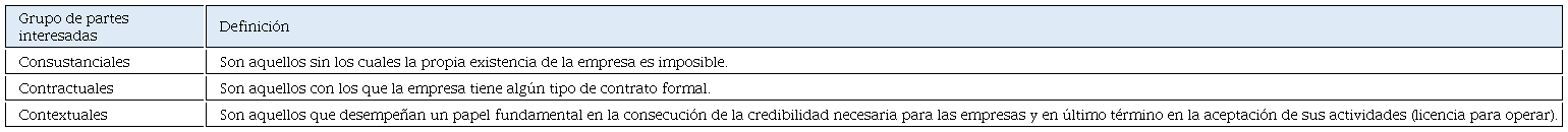 Con base en (Carroll, 1979) la responsabilidad filantrópica abarca actividades voluntarias de una empresa, dicha responsabilidad esta guiada por el deseo de la empresa de participar con las partes interesadas que conforman la comunidad. Sin embargo, en el cuadro 2 se muestra otra clasificación de las partes interesadas.