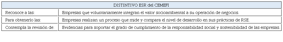 El distintivo Empresa Socialmente Responsable (ESR) es un proceso sistémico para medir y comparar el nivel de desarrollo de las buenas prácticas de responsabilidad social a través de indicadores en los ámbitos ambiental, social, y de gobernanza (ASG) en las empresas. Está referenciado con legislación nacional y normativa internacional y contempla la revisión de evidencias para soportar el grado de cumplimiento de responsabilidad social y sostenibilidad de las compañías privadas, con el fin de acreditarlas con un ícono de valor que las destaca y diferencia de otras empresas que operan en México y América Latina.