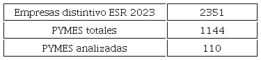 En esta investigación nos concentramos en una muestra de 110 PYMES de siete sectores de las PYMES en México que al año 2023 obtuvieron de 10 hasta 23 veces seguidas el distintivo ESR que otorga el CEMEFI. Del planteamiento anterior se propone y surge la siguiente pregunta de investigación: ¿Cuál es la información pública respecto a las acciones en el ámbito ASG de las PYMES que al 2023 obtuvieron entre 10 y 23 veces el distintivo ESR que otorga el CEMEFI?