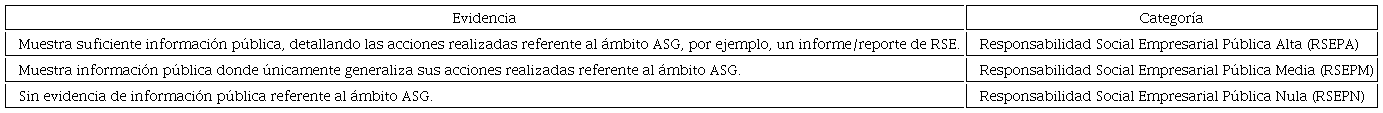 Con base a la información recabada en los tres ámbitos de la ASG de las 101 páginas web analizadas, las cuales corresponden a las 110 PYMES de nuestra muestra. Se determinó que con base en dicha información se determina la categoría de RSE de las PYMES considerando el concepto Responsabilidad Social Empresarial Pública (RSEP) ya que la información obtenida de las páginas web son de carácter público catalogándolo de acuerdo con la evidencia correspondiente en tres categorías: alta, media y nula.