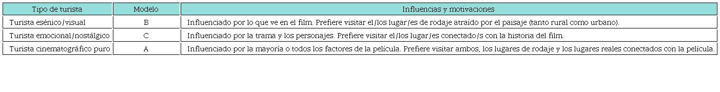 Bolan et al. (2011, p. 102) no solo analizan las motivaciones del turista cinematográfico, sino que lo clasifican en tres tipos, lo que da lugar a tres mercados en el turismo inducido por el cine. En la tabla 1 se recogen sus resultados al respecto.