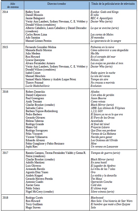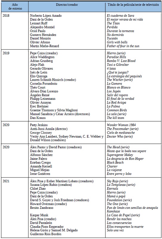 La tabla 2 recoge las principales películas y series que se han rodado en Canarias en el periodo objeto de estudio en este trabajo (2000-2021), y que han sido dadas a conocer al público (estrenadas)1. Como se puede observar en dicha tabla, los paisajes canarios comienzan a verse con mayor frecuencia en las pantallas de cine y televisión, fundamentalmente, en 2008 y años posteriores.