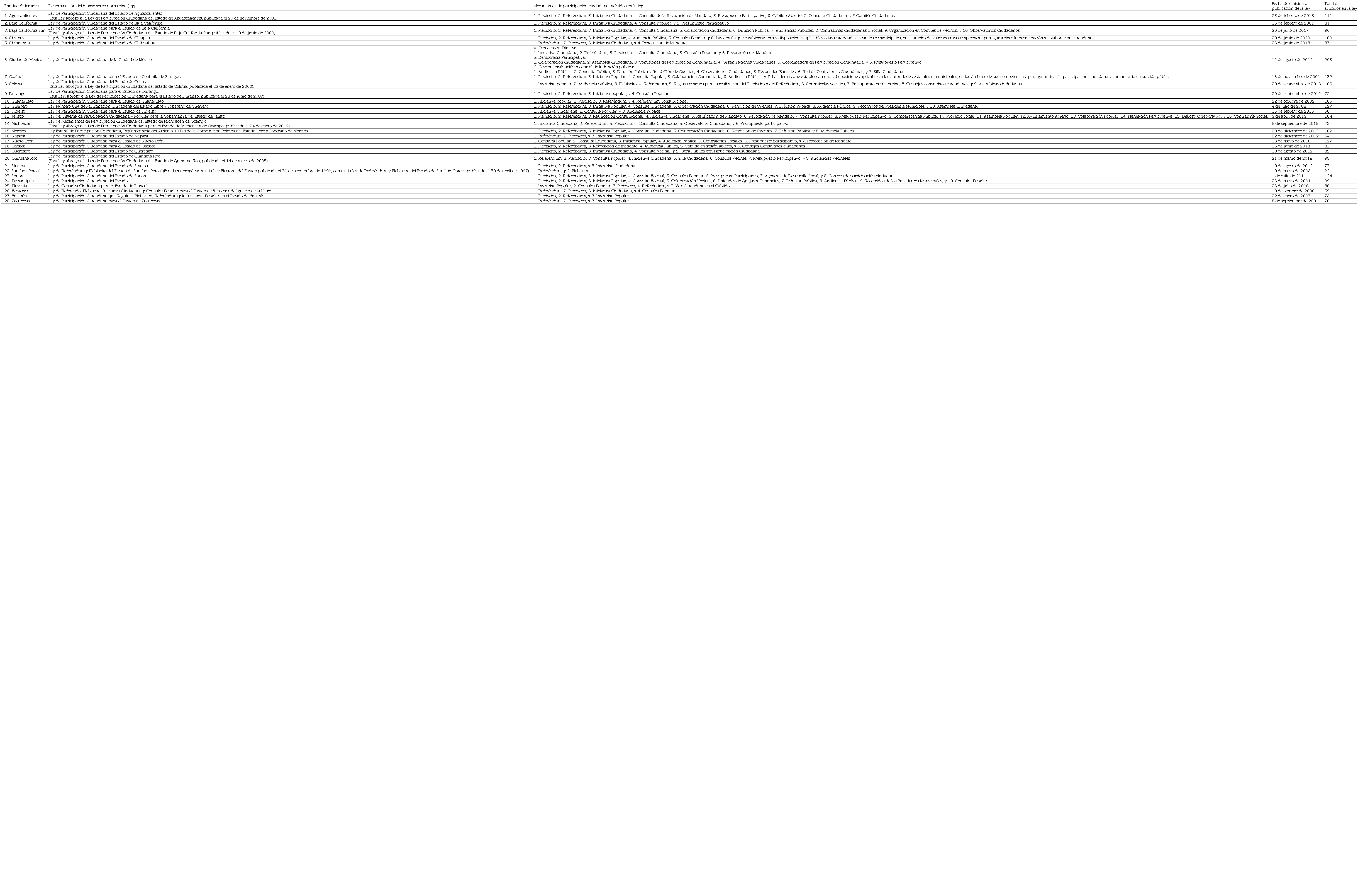 A partir de la información obtenida, se creó una base de datos con los siguientes elementos: 1. Nombre de la entidad federativa, 2. Denominación de la ley, 3. Mecanismos de participación ciudadana contemplados en la ley, 4. Fecha de emisión o publicación de la ley, 5. Número total de artículos, y 6. Observaciones relevantes sobre la fuente consultada.