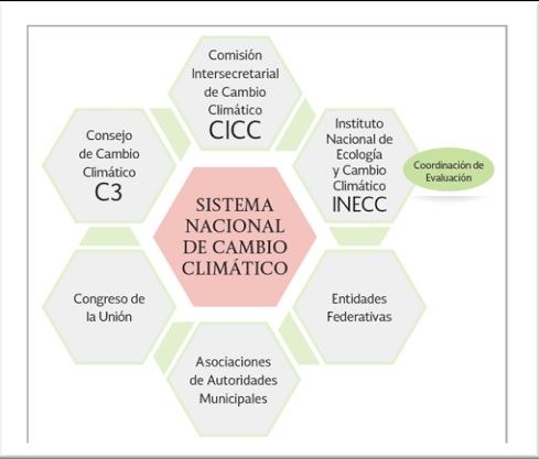 El Sistema Nacional de Cambio Climático está instrumentado en el marco legal en las tres órdenes de gobierno (Ley de Cambio Climático, 2014), que integra la estrategia nacional de planeación; el financiamiento para el cambio climático; los instrumentos que conlleva un control de emisiones, un atlas de riesgo, los aspectos económicos como los fiscales y de mercado, el sistema de información, las Normas Oficiales Mexicanas, y el registro nacional de emisiones; una coordinación de evaluación; y la inspección y vigilancia que describe las sanciones ante el incumplimiento. Dicho sistema describe la estrategia como instrumento rector de la política nacional en el mediano y largo plazo para enfrentar los efectos del cambio climático.