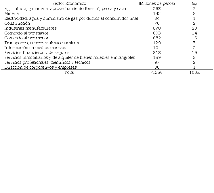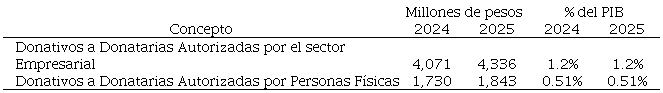 La Secretaría de Hacienda y Crédito Público (2024) estima una renuncia recaudatoria de 4,336 millones de pesos por donativos deducibles de impuestos del sector empresarial para el año 2025 (Tabla 3), siendo la industria manufacturera el sector económico que más contribuye con donaciones (20%), seguido de servicios financieros y de seguros (19%), comercio al por menor (16%), comercio al por mayor (14%). El sector educativo tiene una escasa participación (0.2%).