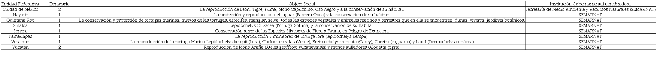 Los resultados indican que en este mismo año hay más de 392 organizaciones que fueron autorizadas para recibir donativos para realizar actividades ecológicas, de protección al medio ambiente, flora y fauna (Tabla 6) y diez donatarias autorizadas que se dedican al cuidado de especies en peligro de extinción y en la promoción del desarrollo sustentable a nivel regional, comunitario (Tabla 7). El aporte enfatiza que la Estrategia Nacional del cuidado al Medio Ambiente fusiona a distintas autoridades gubernamentales, al sector empresarial, y sociedades y asociaciones civiles. Dichas Donatarias Autorizadas están ubicadas en ocho entidades federativas: Ciudad de México (2), Nayarit (1), Quintana Roo (1), Sinaloa (1), Sonora (1), Tamaulipas (1), Veracruz (1) y Yucatán (2). Las autoridades acreditantes de las mencionadas actividades principalmente son la Secretaría del Medio Ambiente y Recursos Naturales (SEMARNAT) y la Comisión Nacional de Áreas Naturales Protegidas o autoridades gubernamentales estatales.