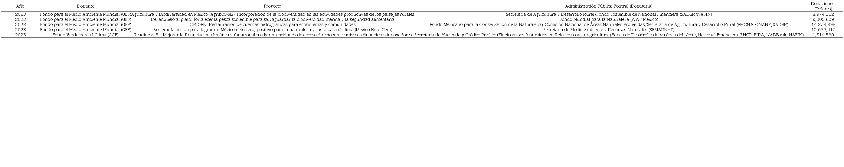 Ahora bien, se identificó a las administradoras públicas federales que recibieron donaciones de Fondos Globales (Tabla 8), donaciones internacionales cuyos proyectos están relacionados con la agricultura, la biodiversidad y el cuidado al medio ambiente. Las entidades gubernamentales que recibieron donaciones para realizar proyectos en el año 2023 fueron la Secretaría de Agricultura y Desarrollo Rural (SADER), el Fondo Sostenible de Nacional Financiera (NAFIN), el Fondo Mundial para la Naturaleza (WWF México), Fondo Mexicano para la Conservación de la Naturaleza (FMCN), la Comisión Nacional de Áreas Naturales Protegidas (CONANP), la Secretaría de Agricultura y Desarrollo Rural (SADER), la Secretaría de Medio Ambiente y Recursos Naturales (SEMARNAT), Secretaría de Hacienda y Crédito Público (SHCP), Fideicomisos Instituidos en Relación con la Agricultura (FIRA), y el Banco de Desarrollo de América del Norte (NADBank).