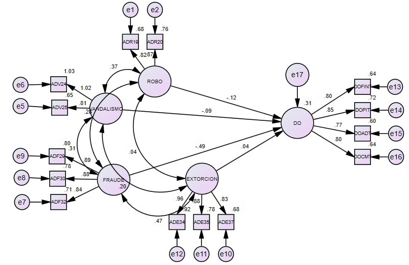 El modelo propuesto busca explicar la relación inversa de las variables actividades delictivas y desempeño organizacional, con base en los resultados obtenidos con el instrumento aplicado a los sujetos de estudio en las empresas comerciales de Ciudad Obregón, Sonora. Cabe mencionar que cada una de las variables a estudiar se dividió en subvariables, el desempeño organizacional (DO) está conformado por: desempeño financiero (DOFI), procesos internos (DOPI), aprendizaje y desarrollo (DOAD). La variable actividades delictivas (AD) se subdividió en: robo (ADR), vandalismo (ADV), fraude (ADF), extorción (ADE).