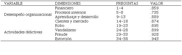 El instrumento fue adaptado con base en Navimipour (2018) y Hubbard (2009), dichos autores por medio de sus investigaciones analizaron algunas de las formas de medición de la variable desempeño organizacional y las dimensiones que esta tiene. Por otra parte, para la variable actividades delictivas se tomaron autores como Zeneli et al (2018), Perdomo y Fondevila (2018) quienes investigaron la influencia que tiene para las empresas dichas actividades y cómo les afecta. en el caso de las actividades delictivas se tomaron aquellas que más se presentan en las empresas comerciales con base en las cifras del INEGI (2023). Se utilizó una escala del tipo Likert de 6 puntos, la cual según Matas (2018) es una escala donde el sujeto de estudio indica el grado en el cual se encuentra de acuerdo o en desacuerdo en una escala de 1 a 6.