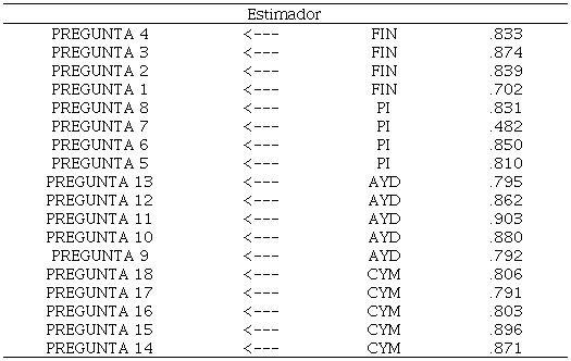 En relación a los índices de ajuste del modelo, según Schumacker y Lomax (2016) cuando el valor del RMSEA resulta menor a 0.05 el ajuste entre el modelo y los datos obtenidos es considerado superior, en este caso el valor RMSEA fue de .044 lo que se considera favorable, por otra parte, el CFI Índice de Ajuste Comparativo resultó en un 0.899 lo que significa que el modelo de medición del cuestionario y los datos se aproximan a un ajuste razonable, por su parte para el GFI se recomienda un valor de 0.90 mayor o igual , en este caso fue de 0.92 lo que indica que el grado del modelo de ajuste iguala a la matriz de covarianza de dicho modelo.