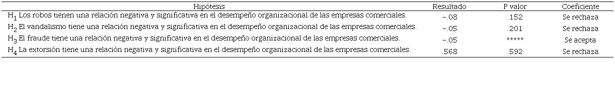 H1. La extorsión tiene una relación negativa y significativa en el desempeño organizacional de las empresas comerciales.
