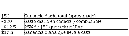 De acuerdo a las personas entrevistadas, el promedio de ganancia diaria está entre 35 US$ y 50 US$. Sin embargo, no es ésta la cantidad que llevan a casa al final del día. Raúl realizó un desglose de lo que en realidad lleva a su casa diariamente después de su trabajo en Uber: