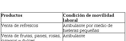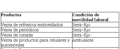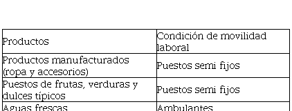 Los comerciantes informales localizados en dichos mercados públicos ofertan diferentes productos y mantienen una condición de movilidad en el espacio público, como se observa en la tabla 1.