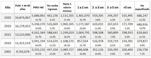 En 2020, la población mayor ocupada mexicana ascendía a 33,7% (5.680.061) de la población mayor total; el 65,1% de ella estaba formada por varones y 34,9% por mujeres. Una tercera parte empezó su trabajo actual después de los 55 años, y el 84,3% no tiene acceso a instituciones de salud por su trabajo. Sus salarios se ubicaban en los niveles más bajos: menos de $247 pesos mexicanos por día para el 71% de la PMO. La tendencia de los últimos 15 años muestra una mayor concentración de trabajadores mayores con bajos salarios, y una reducción de quienes reciben mejores salarios (ENOE, 2020), como muestra la figura 1.