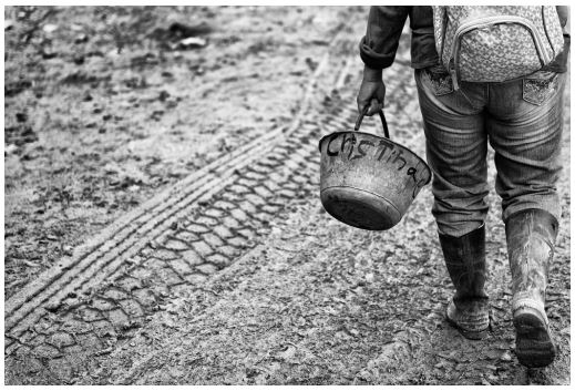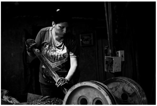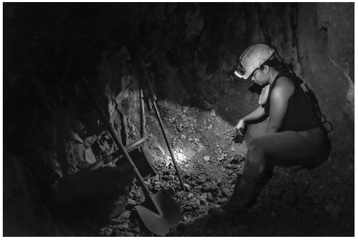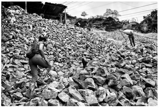 Por esta razón mi trabajo comienza en el molino de La Viuda, en donde doña Cristina y doña Estela trituran, marranean, y limpian el material del que disponen. Doña Estela es minera, entra en los boquetes, limpia tolvas, rellena bultos, etc., para conseguir material y poder llevarlo al molino. Doña Cristina es guachera, recoge material de los accesos a las minas y de a poquito se va haciendo de sus bultitos. La conversación fluye entre el ruido del marrano y las mesas, pregunto más de lo que respondo y noto enseguida el orgullo que les genera a estas mujeres ganarse el pan y el futuro a fuerza de martillo. Un orgullo que voy a reconocer y retratar en cada una de ellas. Me despido de doña Estela y doña Cristina con la promesa de un pronto reencuentro y me dirijo a la mina La Villonza en donde me espera Alejandra, una joven minera que me permitió acompañarla en su día de trabajo.