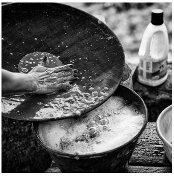 El último paso es “la batea”, un plato de madera muy dura que, por medio de un movimiento muy preciso, termina de separar el polvo de oro del resto de material, Las impurezas son quemadas con ácido sulfúrico y finalmente obtenemos el tan preciado metal.
