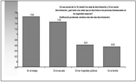 Por último, se les preguntó ¿qué tanto cree usted que se discrimina a las personas homosexuales en los siguientes espacios? (figura 1) con una medición por escala de 0 al 10 (0 es nada de discriminación y 10 es mucha discriminación) el espacio que tiene el mayor puntaje es “en el trabajo” con una calificación de 7,64, seguido de “en la escuela” con un 7,45, “en los hospitales públicos” con 6,61 y por último “en la familia” con 6,55 (2005b: 111–113).