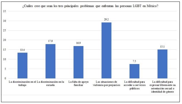¿Cuáles cree que sean los tres principales problemas que enfrentan las personas LGBT en México? (figura 2). El 29,2% de la población encuestada comenta que los principales problemas que enfrentan las personas LGBT en México son las situaciones de violencia por prejuicio; el 15.1% declara que es la dificultad para expresar libremente su orientación sexual o identidad de género; el 13,4% cree que es la discriminación en el trabajo y el 7,5% considera que es la dificultad para acceder a servicios públicos.