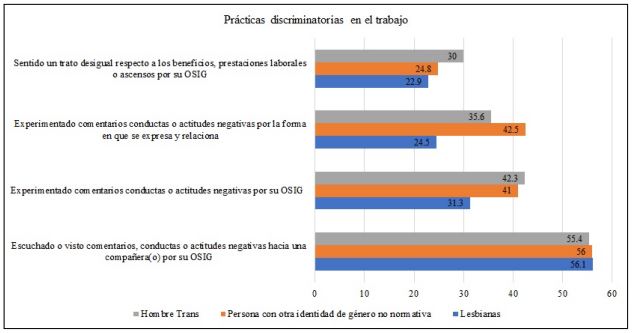 Los porcentajes más altos corresponden a la respuesta Escuchado o visto comentarios, conductas o actitudes negativas hacia una compañera(o) por sexuales y/o identidades de género (OSIG) correspondiente al 56,1% de las lesbianas, el 55,4% de hombres trans y el 56% de personas con otra identidad de género no normativa. La siguiente respuesta con mayores porcentajes es, Experimentado comentarios conductas o actitudes negativas por su orientación sexual o identidad de género, opción que refleja la opinión del 42,3% de los hombres trans; el 41% de las personas con otra identidad de género no normativa y el 31,3% de las lesbianas. Para el 42,5% de las personas con otra identidad de género no normativa; el 35,6% de hombres trans y el 24,5% de lesbianas, una práctica discriminatoria en el trabajo es haber Experimentado comentarios conductas o actitudes negativas para la forma en que se expresa y relaciona y, por último, el 30% de los hombres trans; el 24,8% de personas con otra identidad de género no normativa y el 22,9% de las lesbianas refieren haber Sentido un trato desigual respecto a los beneficios, prestaciones laborales o ascensos por su orientación sexual o identidad de género.