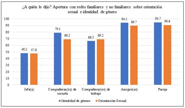 Otro dato importante que arroja es la comunicación de su orientación sexual o identidad de género a redes no familiares. En la figura 4 se puede observar que la apertura con su jefe(a) está por debajo de la mitad del porcentaje en comparación de la pareja o amigos(as); y en el caso de la comunicación con compañeras(os) de trabajo es menor al de las compañeras(os) de escuela. En el caso del ambiente laboral, se difunde más la orientación sexual (69,2%) en comparación con la identidad de género (66,5%).