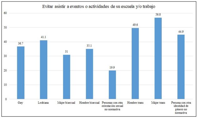 Por último, se cuestiona si por temor a sufrir discriminación se evitaría asistir a eventos o actividades de su escuela y/o trabajo; el 49,6% de hombres trans; el 44,9% de personas con otra identidad de género no normativa y el 41,1% de lesbianas respondieron afirmativamente, es decir, que no asistirían a eventos o actividades de su escuela y/o trabajo (figura 5).