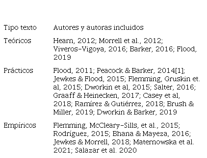 Los textos revisados son de tres tipos: teóricos, empíricos y prácticos. Los primeros desarrollan aspectos teóricos relativos a masculinidades y/o violencia de género. Los segundos reportan resultados de investigaciones para analizar los factores asociados a la violencia ejercida por hombres. Por último, los terceros reportan hallazgos o reflexionan sobre modelos de intervención con hombres, mayoritariamente primaria, para abordar la violencia de género. Se excluyeron resultados de la búsqueda que no abordan la violencia masculina, que fueran sobre prevención terciaria o específicos sobre atención a hombres agresores. En el caso de las intervenciones, se privilegiaron artículos que reportaban revisiones de intervenciones más que artículos que reportaban intervenciones específicas. En la tabla 1 se presentan los artículos que componen la base de esta revisión según el tipo de artículos.